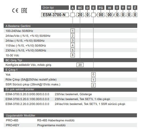 ESM-3700-N.1.20.0.2/00.00/0.0.0.0 Proses Göstergesi 100-240Vac EMKO