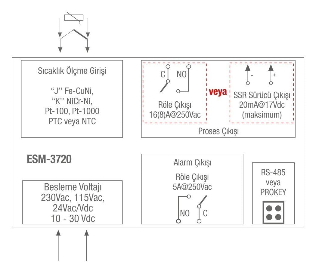 Sensör Girişi | NTC, PTC, TC, RTD J, K, (IEC584.1) (ITS90) parametreleri arasından seçilebilir PT-100 (IEC751) (ITS90) PT-1000 |