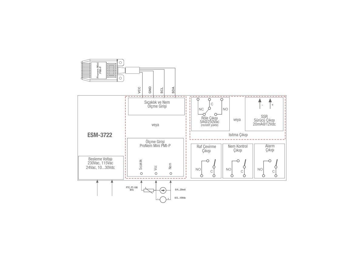 | Sensör Girişi | NTC, PTC, PT-100, 0/2...10Vdc, 0/4..20mAdc veya Pronem Mini PMI-P |