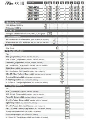 | Opsiyonel Çıkışlar | EM0-400 Röle Çıkış Modülü (3A@250V) EM0-410 SSR Çıkış Modülü (20mA@18V) EM0-420 Dijital (Transistor) Çıkış Modülü (40mA@18V) EM0-430 0/4-20mA Akım Çıkış Modülü |